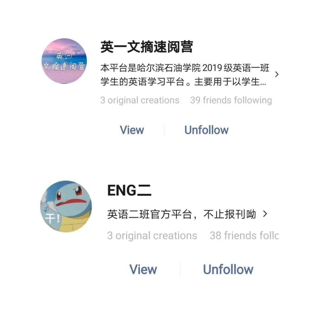 在《英语报刊选读》课程中,为了提高学生搜集整合信息以及英语应用表达能力,我安排每个班级建立自己的报刊阅读微信公众号,每名同学通过对自己感兴趣的新闻报刊进行阅读整理,并配有语音朗读,有效激发了学生阅读报刊的热情,同时也让更多的学生喜欢上了这门难度稍大的阅读课程。现公众号已运营两周,陆续我也会通过这样的形式组织更多的活动,带领学生共同学习进步。