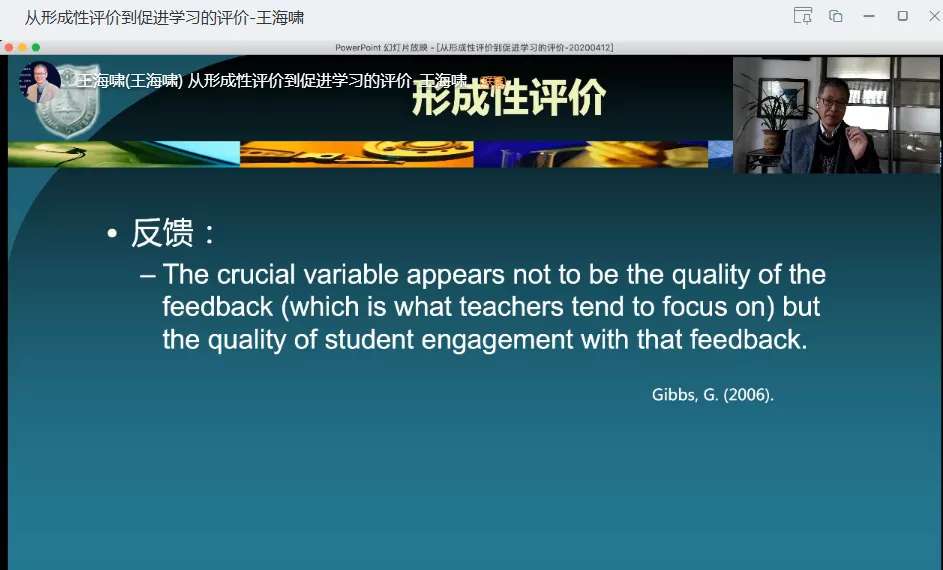 疫情期间,本着继续贯彻“停课不停学,停课不停教,停课不停研”精神,大学外语部全体教师一方面将教学工作从课堂搬到了网上,另一方面,也积极参加各类线上教学培训和讲座,充电提高自己。为更好利用在线教学契机,提高在线教学效果,2020 年4月12日上午9:30-11:00,外语学院大学外语部的老师们在钉钉参加了外教社思飞学院举办的主题为《从形成性评价到促进学习的评价》的学术讲座。