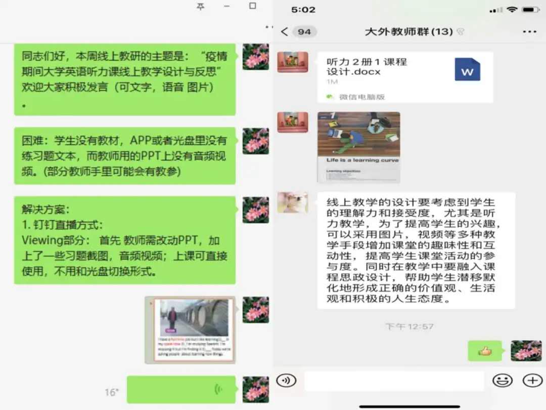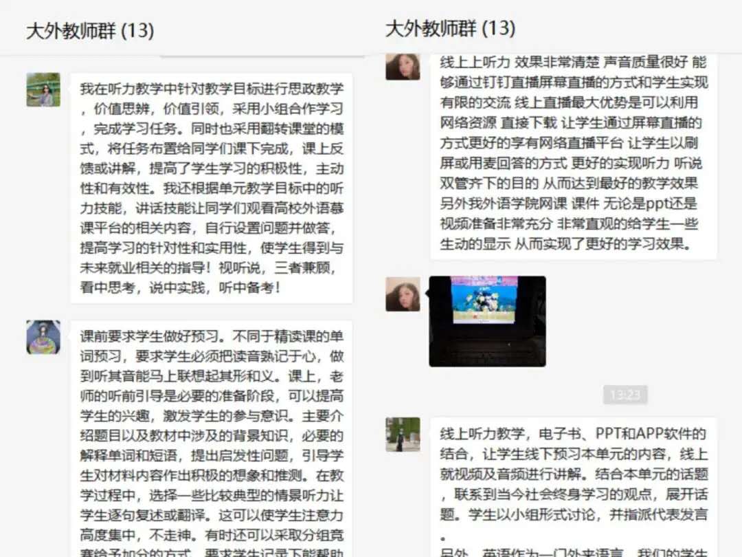 2020年4月20日下午,大学外语部在微信群内开展了主题为 “疫情期间大学英语听力课线上教学设计与反思”别开生面的线上研讨会。