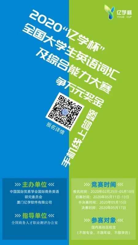 此次大赛旨在为全国各大高校在校大学生打造一个自审英语词汇水平,提升自身外语词汇量和应用能力的竞赛平台,是一场集合了趣味性、专业性、挑战性等特性的比赛。大赛面向全体学生,手机线上答题,还能争万元奖金,一起参与吧!