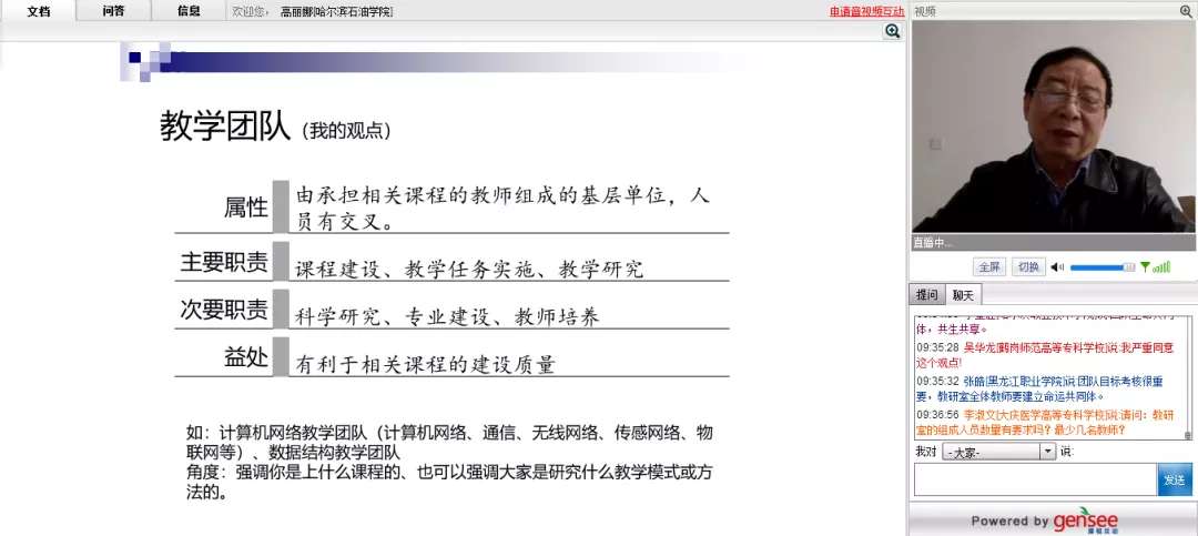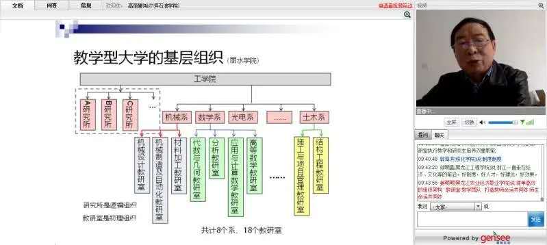 陈教授从专业建设、课程建设、团队协同、教学文化等方面,对基层教学组织建设和管理应该遵循的基本要求和运行规律进行了重点阐释。讲座的进行中,参会的领导、老师们通过直播窗口积极地参与讨论,发表自己的看法,向陈教授咨询基层组织建设与管理中遇到的问题。