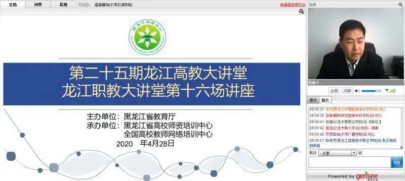 2020年4月28日,外语学院副院长高丽娜参加了第二十五期龙江高教大讲堂,本次讲堂邀请了浙江工业大学的陈庆章教授,为省内所有高校二级学院的领导、系部主任和教研室主任们做了主题为高校基层教学组织建设与教学管理的讲座。