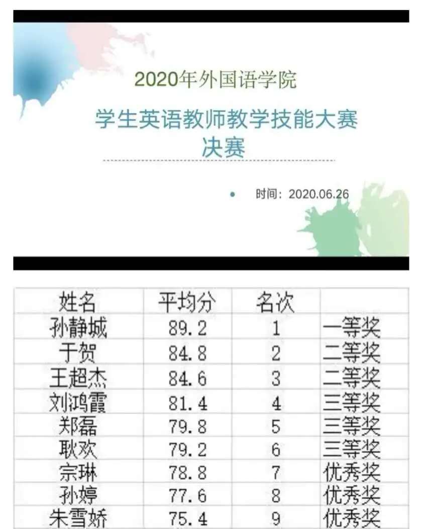 2020年6月26日,2020学生英语教师职业技能系列竞赛之教学技能大赛决赛在云端举行。英语专业9名选手参加了本次比赛。2017级英语专业1班的孙静城同学在决赛中以其良好的英语表达能力、创新的教学设计得到了评委和观众的高度认可,荣获了一等奖。