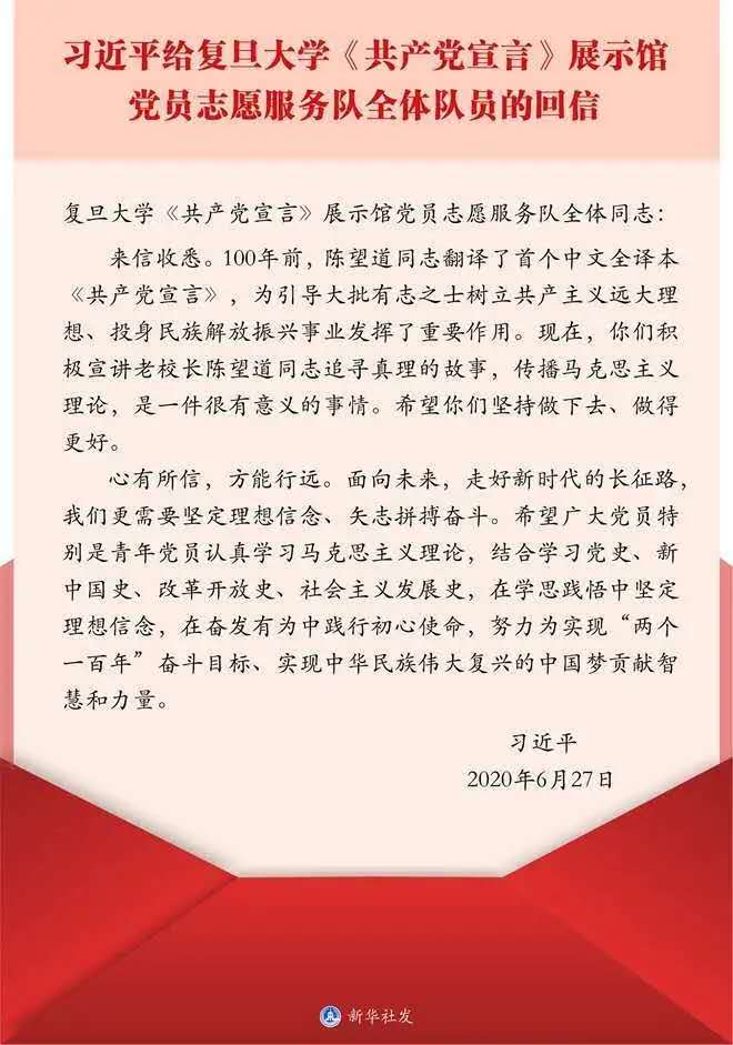 中共中央总书记、国家主席、中央军委主席习近平近日给复旦大学《共产党宣言》展示馆党员志愿服务队全体队员回信,勉励他们继续讲好关于理想信念的故事,并对全国广大党员特别是青年党员提出殷切期望。