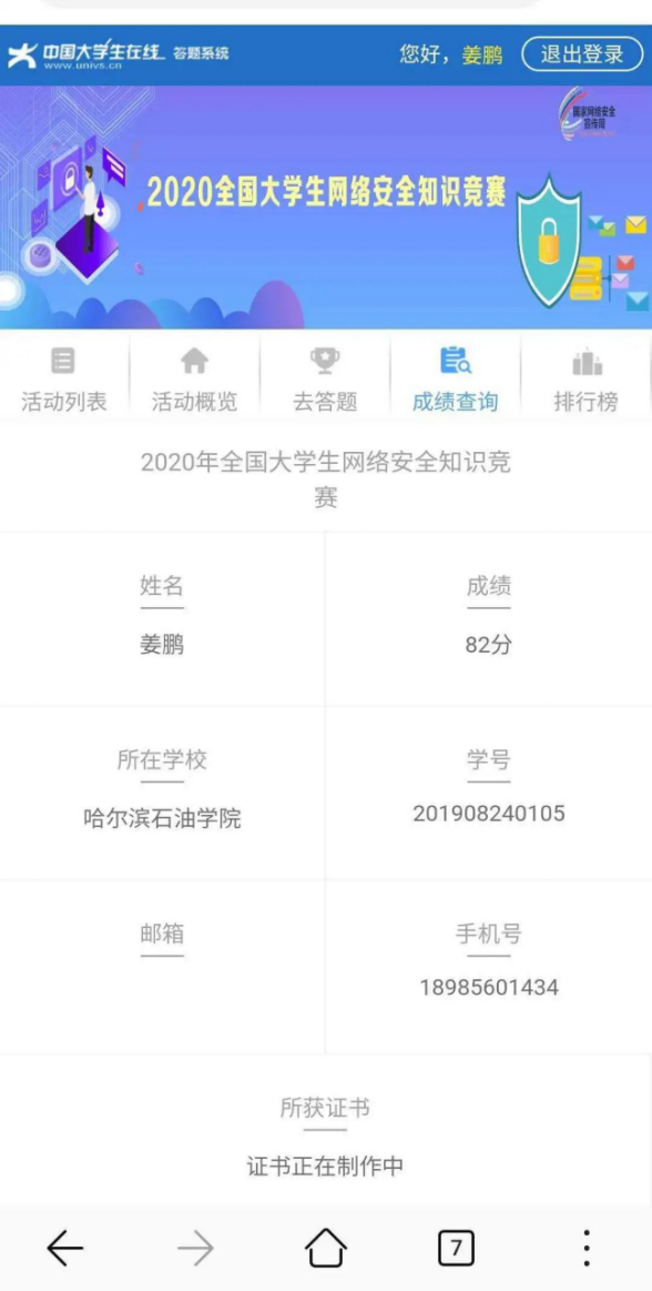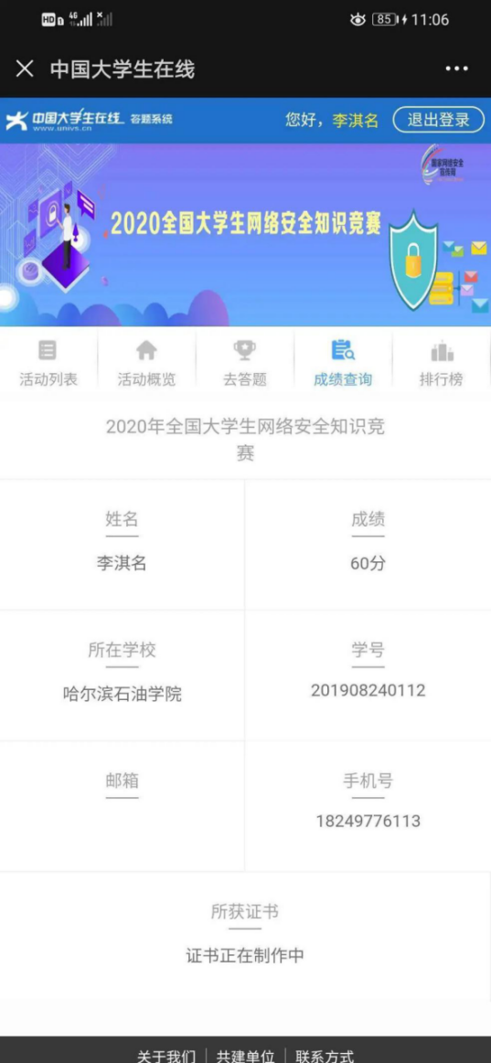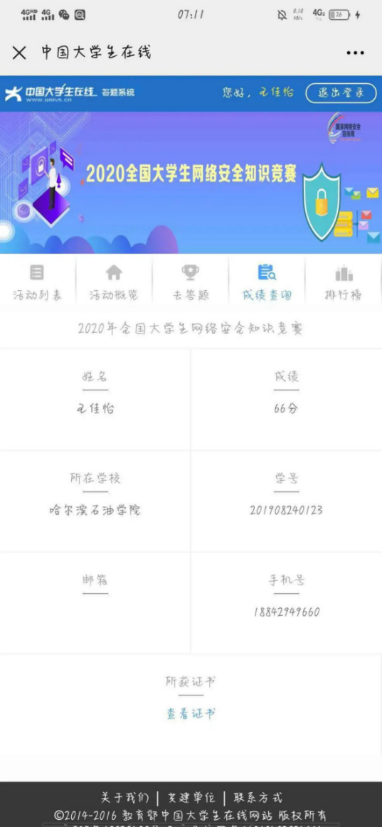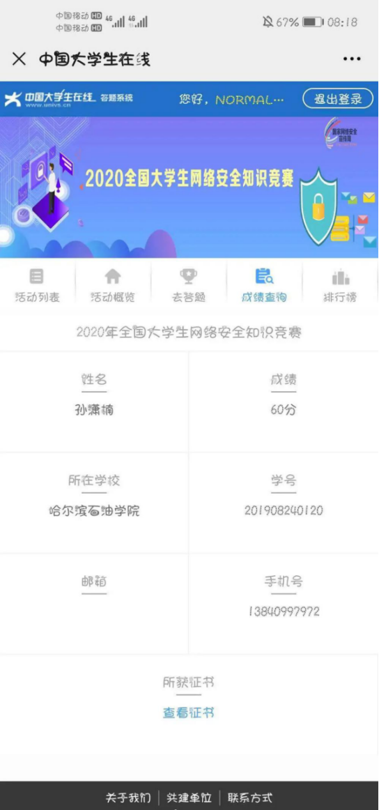 (二)参加“2020年全国大学生网络安全知识竞赛”活动。外国语学院于9月18日—9月19日组织全院学生在线答题。该活动通过网络答题的方式普及网络安全知识,提升了学生网络安全防护技能,为我院未来的网络安全工作打下了坚实基础。