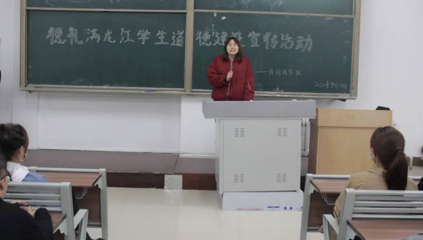 为贯彻落实《新时代公民道德建设实施纲要》精神,广泛宣传普及新时代公民道德建设新任务新要求,提升学生道德素质,外国语学院于9月23日开展“德礼满龙江”学生思想道德建设宣传活动。外国语学院党总支副书记孙晓萍主持此次活动。