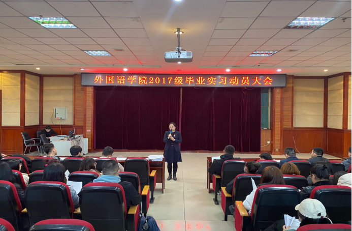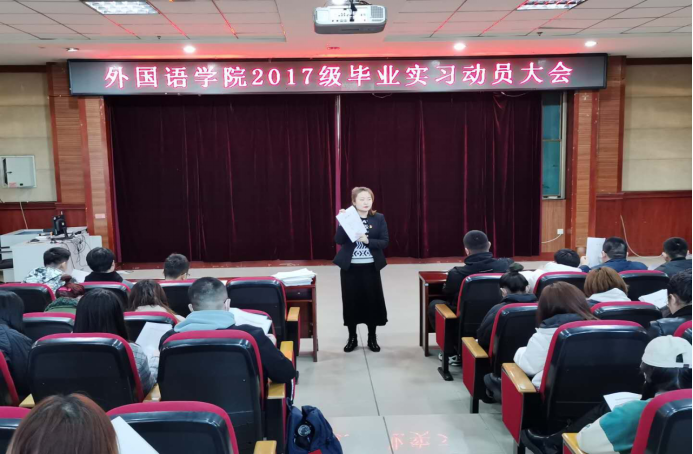 为进一步做好2017级毕业生离校教育,完善毕业生实习工作,引导学生做好实习心理准备,确保毕业生安全、文明、有序毕业实习,帮助毕业生能更好的面对未来的工作,外国语学院于2020年10月27日在主教518举行了2017级毕业生实习动员大会,外国语学院副院长高丽娜 ,外国语学院党总支副书记孙晓萍,外国语学院教学秘书纪凤君及外国语学院2017级全体毕业生参加了会议。