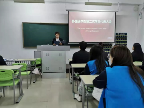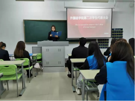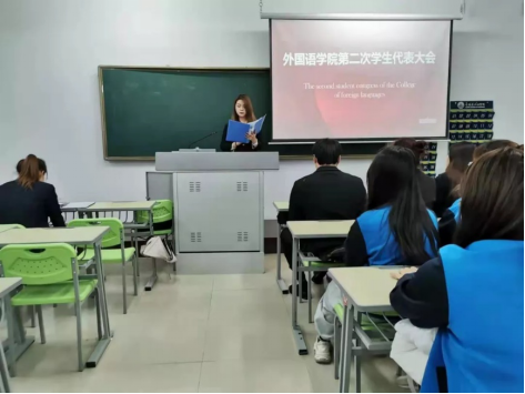 紧接着,外国语学院上一届学生会主席代表丁姝月对上一届学生会工作进行总结汇报,阐述了外国语学院去年获得的众多荣誉。