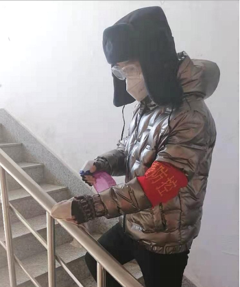 外国语学院2019级俄语一班学生朱春旭,家住吉林省长春市公主岭市河北街道农场社区。同时他是一位“若有战,召必回”二度参与防疫工作的志愿者。2021年1月18日,公主岭市疫情防控工作进入关键时期,社区防疫工作人手紧缺,很多居民的自我防护意识已经有所提高。他始终没有忘记自己的身份,选择继续进行防疫,再次到防疫工作队伍的一线中。1月21日是公主岭全城居家隔离的第四天。这天一早他同社区工作人员通了电话,社区干部听了他的话后,同他的家人光荣地加入了“河北街道农场社区志愿者服务队”—参与邮政小区的楼道消杀工作。这个小区是一个老旧小区,十四个人共分为七个小组,两个人负责一个单元楼道消杀的工作;这个任务虽然很简单、也很枯燥,但这项工作也更考验着志愿者们的耐心和细心;特别是为楼梯扶手的消毒,考验着志愿者们的耐心程度;一天消杀两遍,从一楼到七楼。虽然一趟下来大汗淋漓,但这丝毫没有消减志愿者积极性。