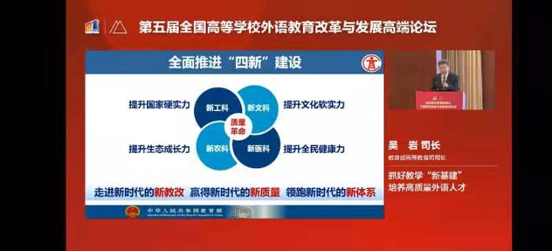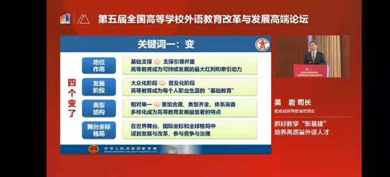 第五届全国高等学校外语教育改革与发展高端论坛于春分日在北京及线上同步开幕。本届论坛主题为“铸教、铸人、铸魂”。教育部领导、教指委专家及高等外语教育百余位专家学者共聚北京,13.5万名全国外语教育同仁通过直播线上参会,共探新时期外语教育高质量创新发展之路,共谋百年变局下高等外语教育铸魂育人新格局。