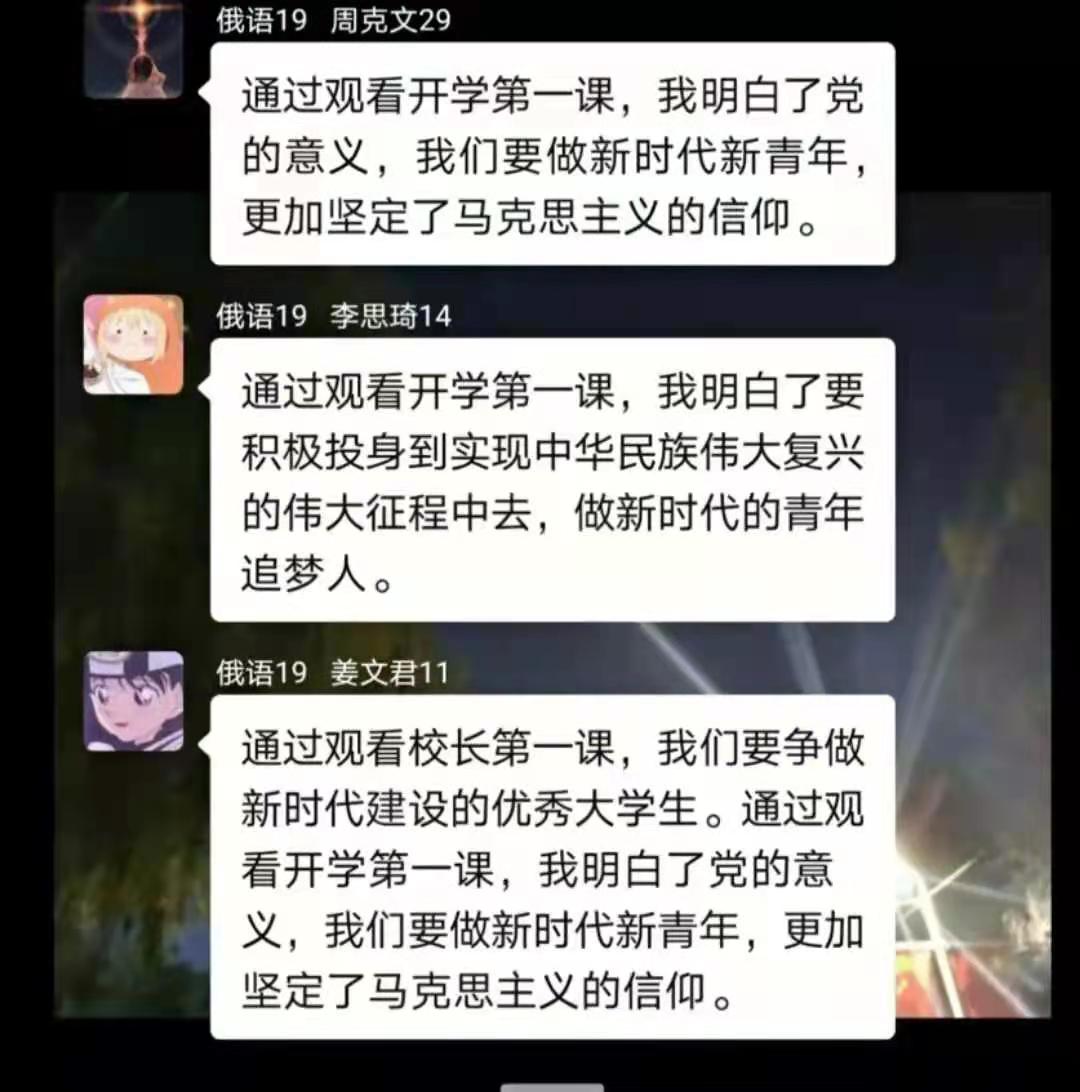 各年纪观看结束后,在辅导员的带领下同学们展开激烈讨论。同学们在讨论后纷纷表示:铭记历史才能走向未来。在实践中探索,在反思中前进,用心、用情、用智,在新学期中找到一条更适合自己的学习之路,在努力学习好专业知识,练就过硬本领,做一名合格的大学生,担当民族复兴大任。辅导员表示,希望在书记的教导下以更坚定的信心、更顽强的意志、更果断的措施,坚决执行学校的各项规定,将做好疫情常态化防控工作与落实立德树人根本任务结合起来。