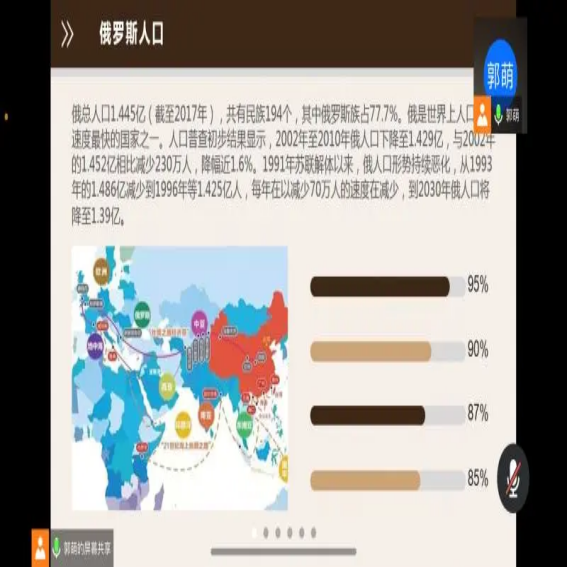 俄语专业学生班主任郭萌老师从一带一路的国家政策与俄语国家的联系,再到俄语专业的就业机遇开始专业教育,