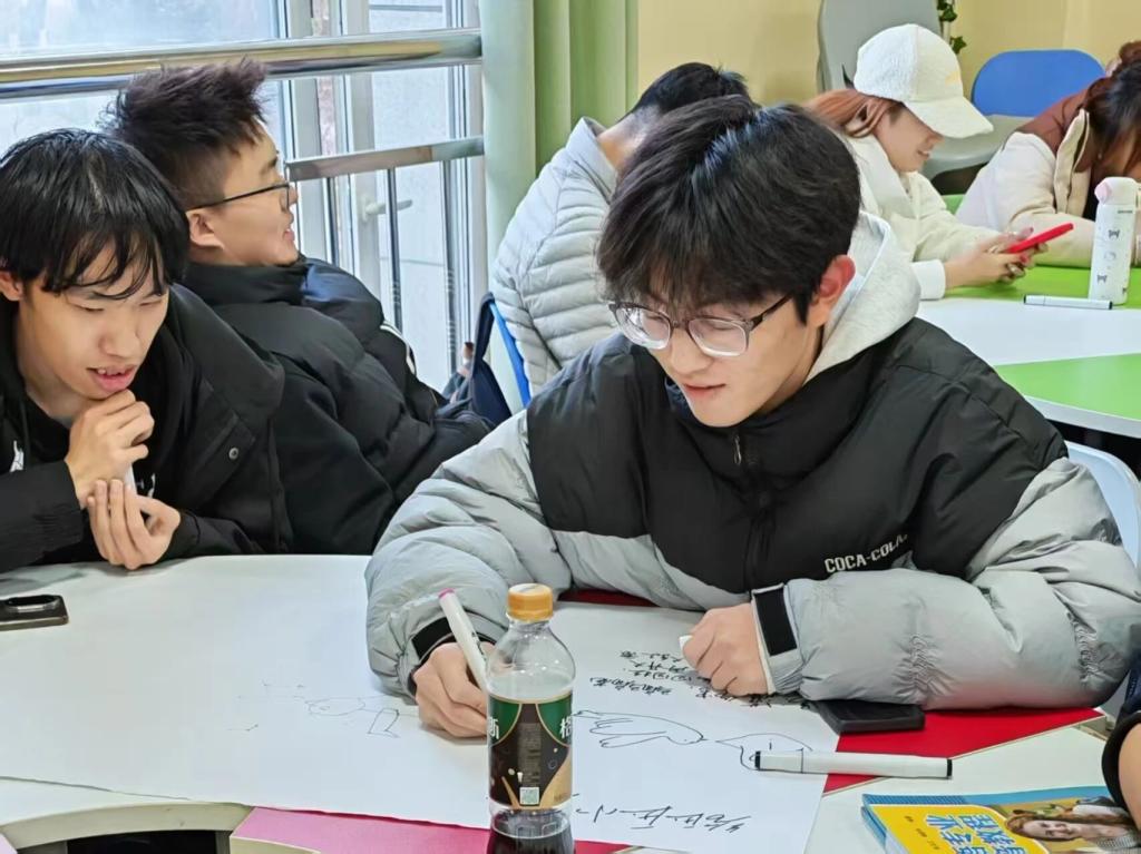本次活动设置了三个富有深意的环节。首轮“小组命名”环节中,各新生小组通过共同构思队名、设计团队名称和口号,并在画布上进行集体创作,快速建立起团队认同感。随后的“盲说盲画”环节要求一名成员蒙眼作画,其他成员通过语言指导协助完成作品,有效增进了新生之间的沟通默契。