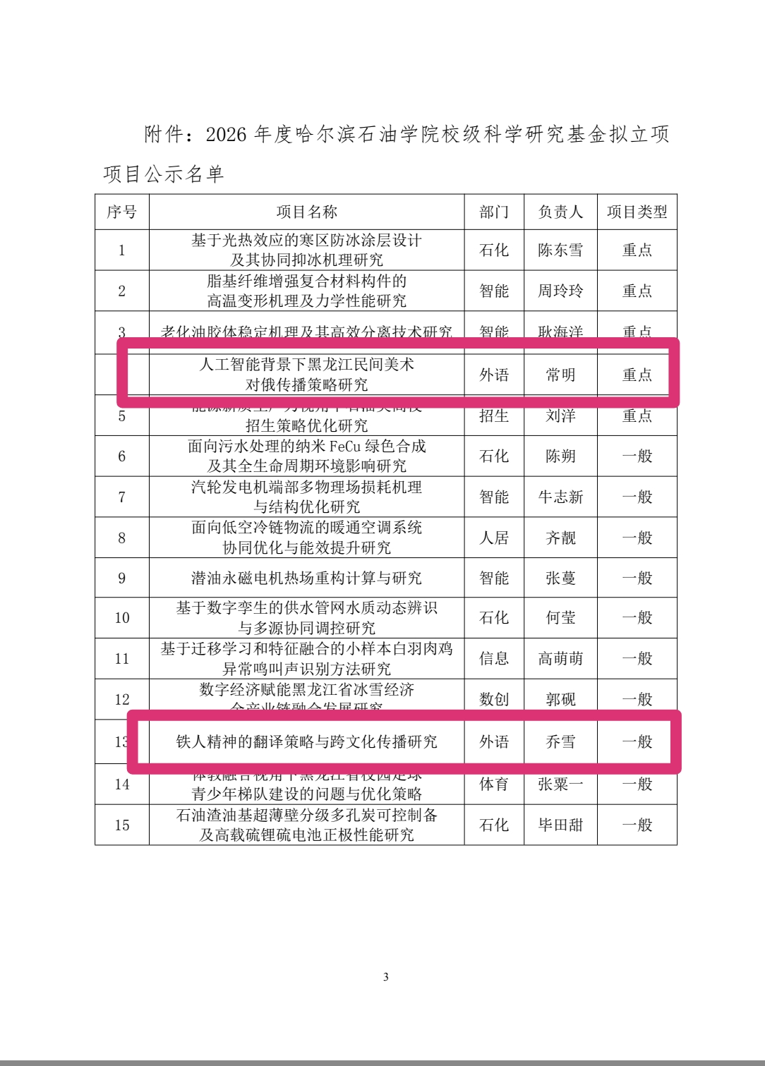 近日,校级科学研究基金项目立项结果公布,我系常明老师主持的《人工智能背景下黑龙江民间美术对俄传播策略研究》入选重点项目,乔雪老师主持的《铁人精神翻译策略与跨文化传播研究》获批一般项目。