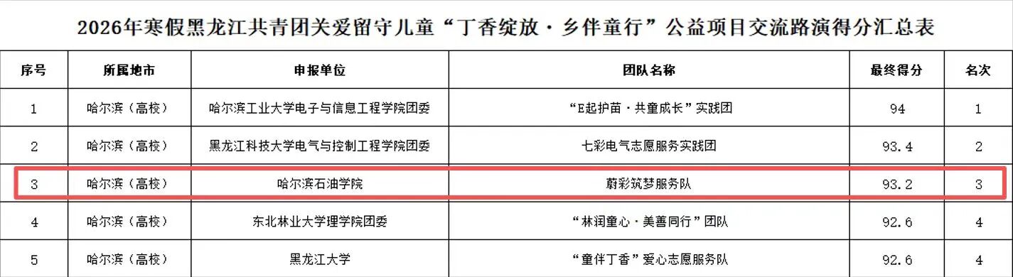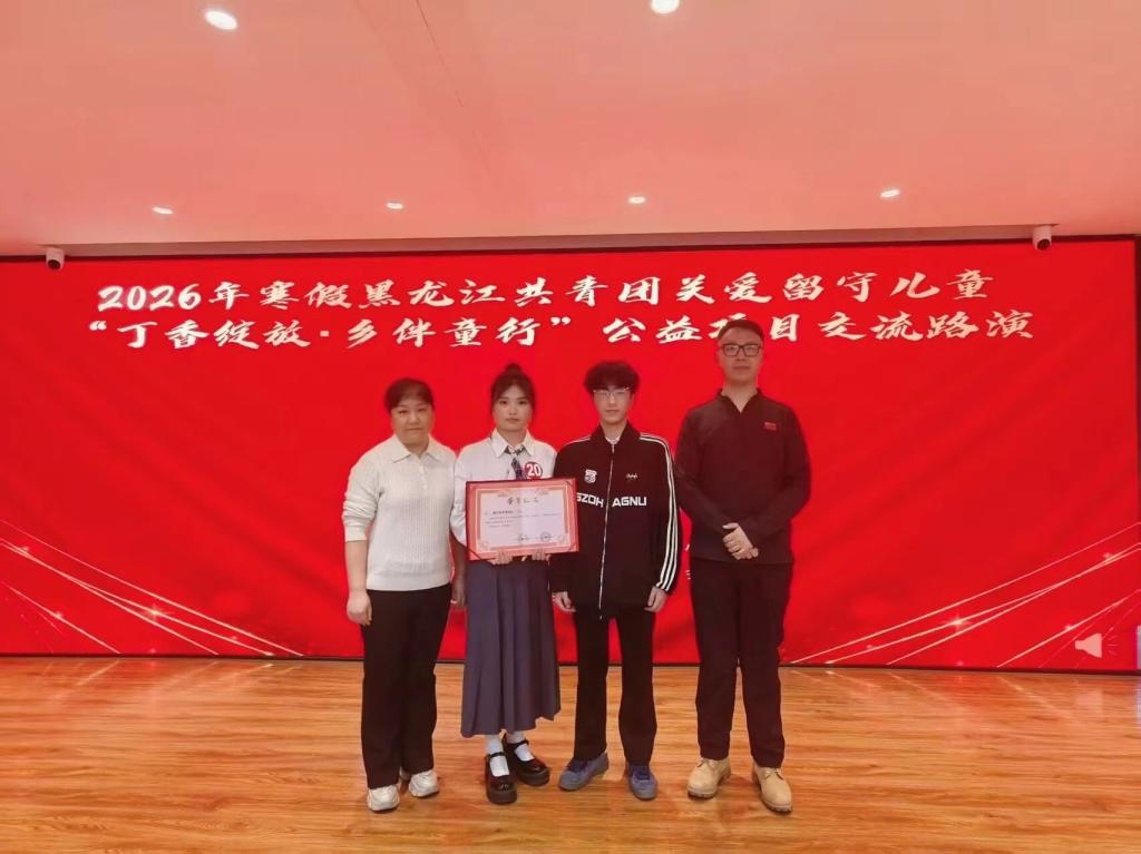 近日,外国语学院“蔚彩筑梦服务队”参加了2026年寒假黑龙江共青团关爱留守儿童“丁香绽放·乡伴童行”公益项目交流路演。在全省45支参赛队伍的同台竞技中,服务队凭借扎实的服务功底与鲜明的项目特色脱颖而出,最终斩获全省第三名的优异成绩,同时被授予“最美志愿服务团队”荣誉称号,用青春行动彰显我院学子的责任与担当,充分展现了我院志愿服务工作的扎实成效与外语青年的昂扬风采。