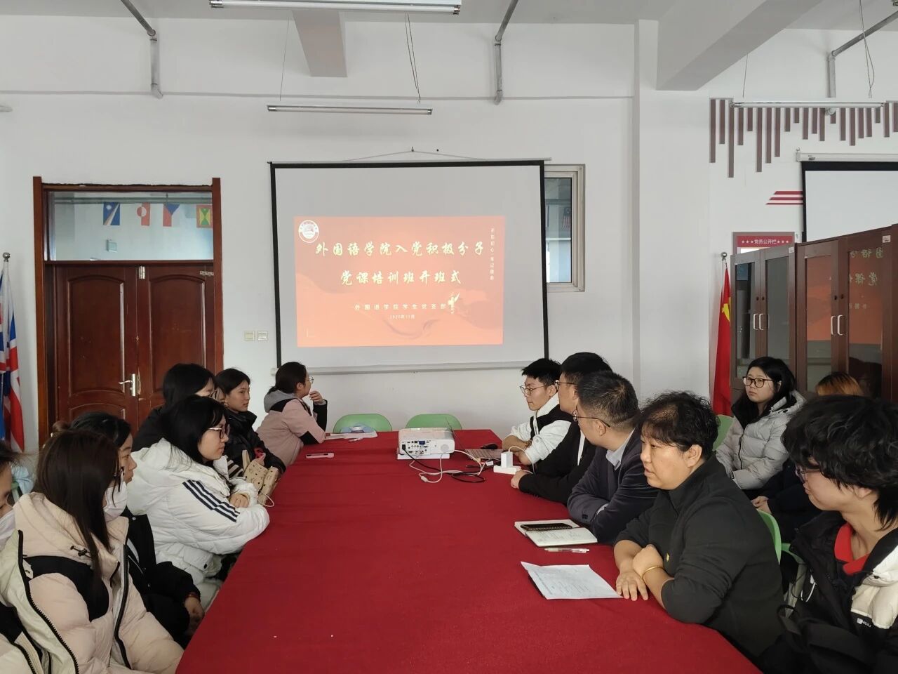 为筑牢青年学子理想信念根基,切实做好入党积极分子培养工作,外国语学院入党积极分子党课培训班开班式在主教706会议室举办。学院党总支书记毛雷、学生党支部书记赵连琦、辅导员郑智慧及全体入党积极分子共同参加。