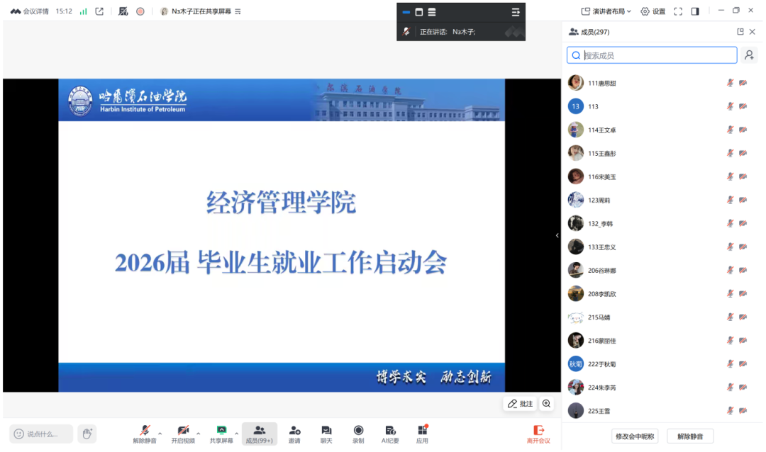 为深入贯彻落实学校关于2026届毕业生就业工作的决策部署,充分发挥党建引领作用,精准赋能2026届毕业生就业工作,2025年11月19日,经济管理学院线上召开“党建引领聚合力,就业赋能启新程”2026届毕业生就业工作启动会。学院院长任洪云、党总支书记宋旭、毕业班辅导员李金梅、李茜及全体2026届毕业生参加会议,会议由毕业班辅导员李茜主持。