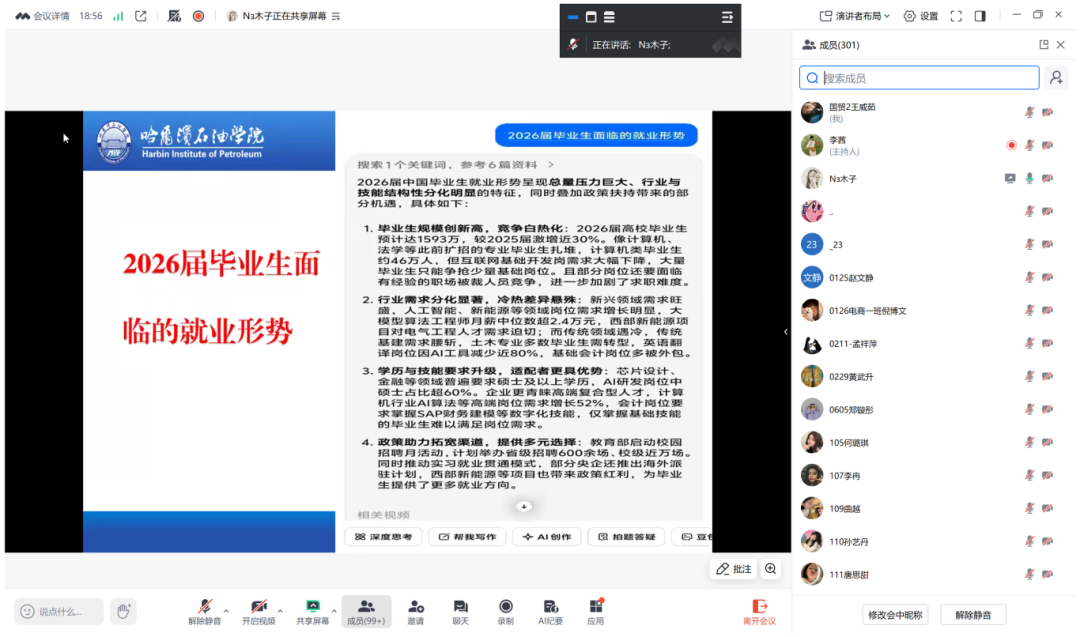 任洪云院长重点围绕“树立正确就业观念”展开,结合当前经济发展态势、行业人才需求特点及学院毕业生就业数据,深入剖析了当前就业市场的机遇与挑战。她强调,就业是实现个人价值的重要途径,全体毕业生要摒弃“眼高手低”“追求安逸”等错误认知,树立“先就业、再择业、后创业”的理性择业观,主动关注基层岗位、重点行业领域的就业机会,在实干中积累经验、成长成才。增强了毕业生对就业形势的认知。