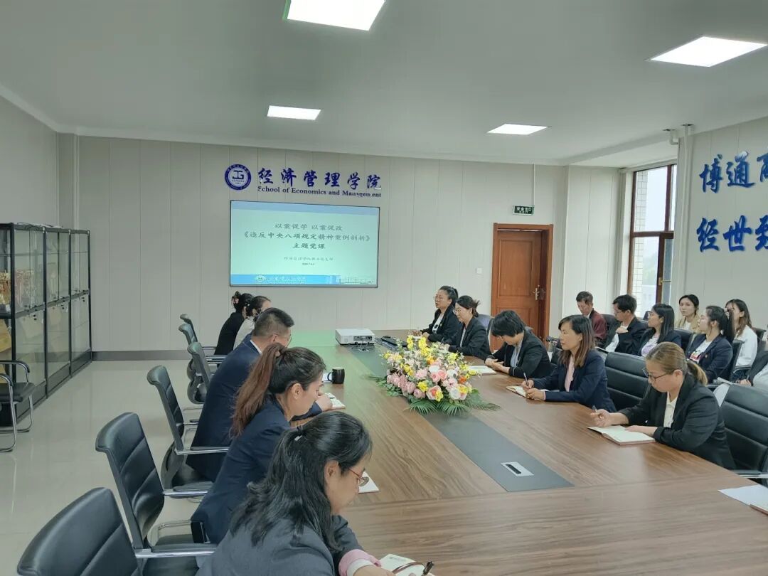 为扎实推进深入贯彻中央八项规定精神学习教育,进一步加强党风廉政建设,提高党员干部的纪律意识和规矩意识,6月10日,经济管理学院教工党支部在第二教学楼601党员之家开展以《违反中央八项规定精神案例剖析》为题的主题党课学习,经济管理学院院长任洪云主讲,全体教师党员参加。