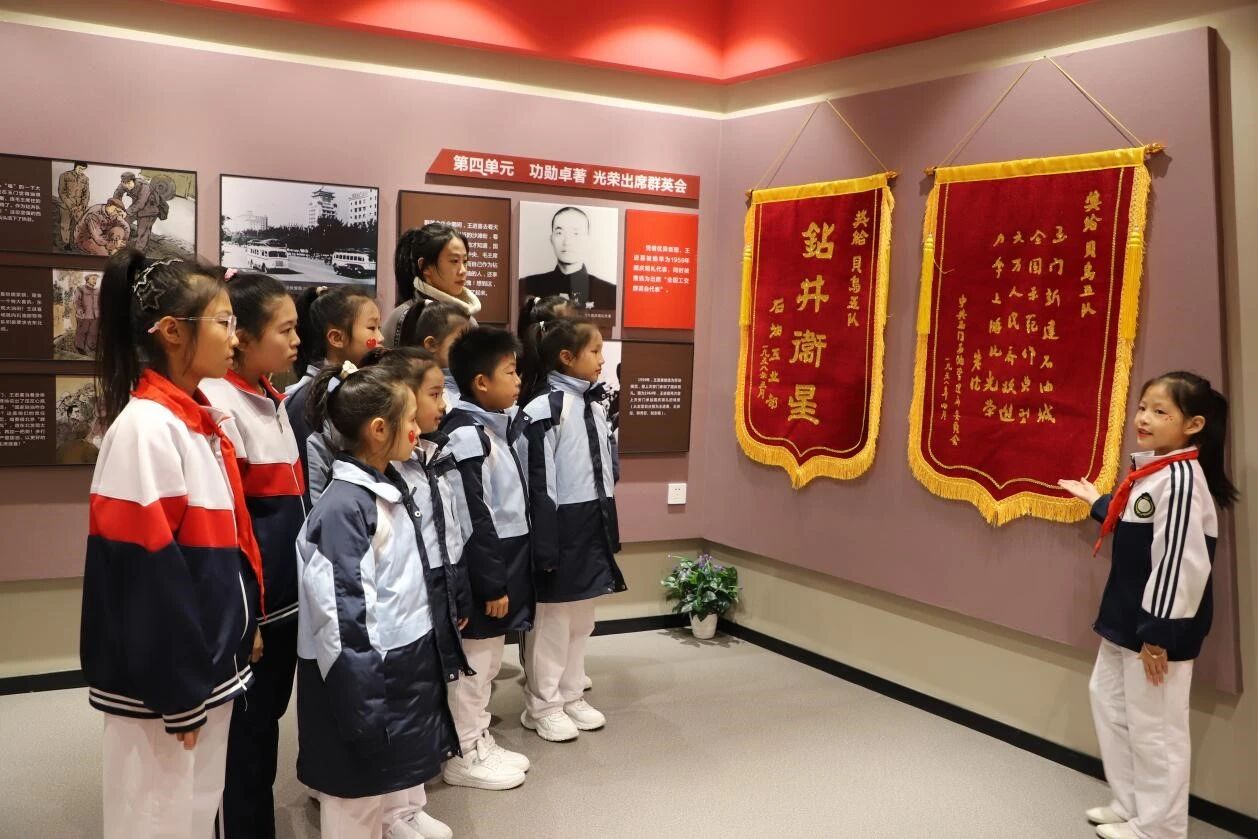 在我校“铁人精神学习社”志愿者的引导下,两校师生们一同走进铁人精神育人馆。大学生讲解员马一鸣为小学生们开启了一场铁人精神代代传的精彩讲解。一幅幅珍贵的历史照片,一件件珍贵的文物、文献,把同学们带回到了那段激情飞扬的岁月,感受到了20世纪60年代以王进喜为代表的石油人开采石油的种种艰辛,感悟如今幸福生活的来之不易,对铁人精神的深刻内涵有了更直观、更深刻的理解。
