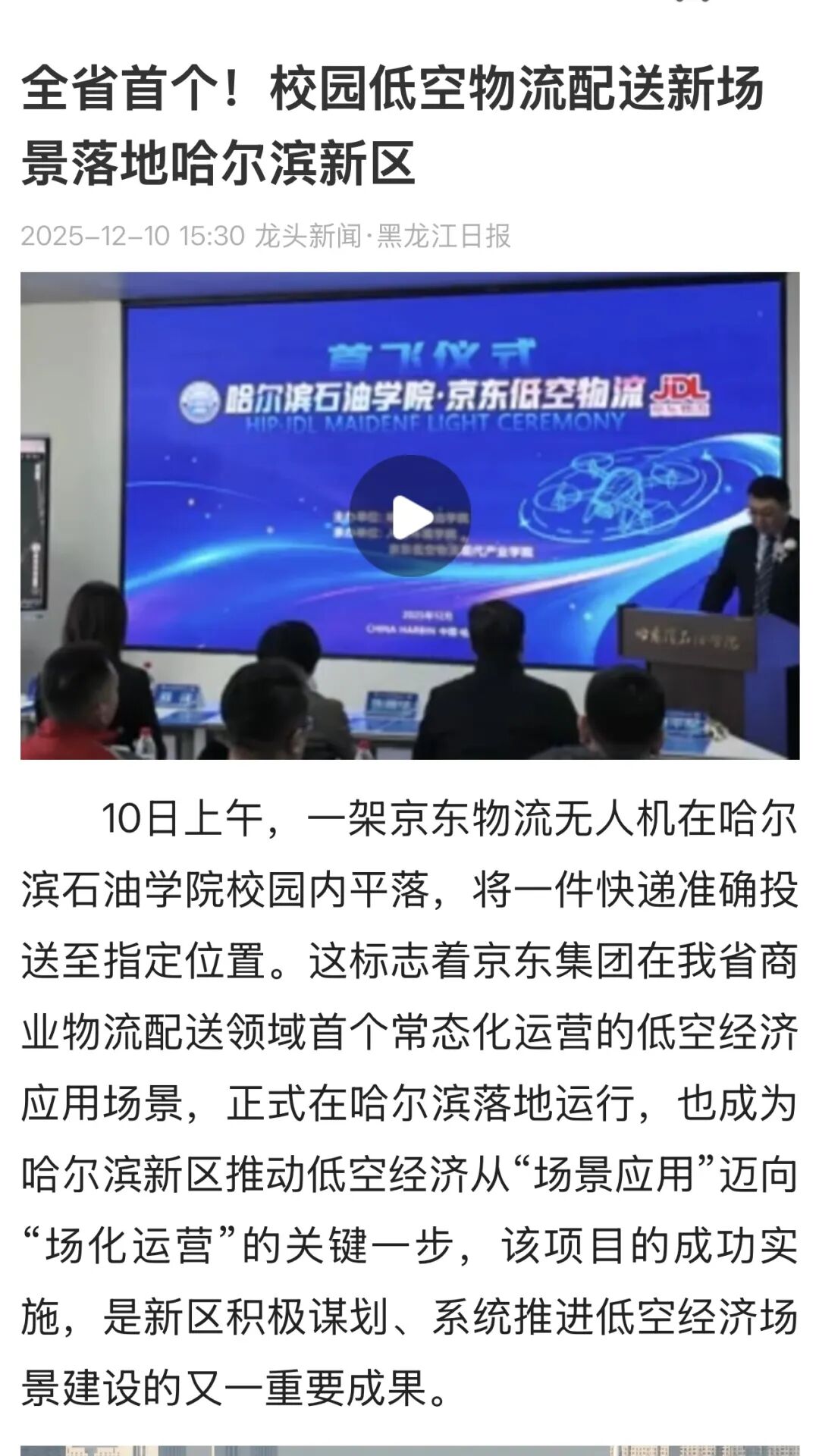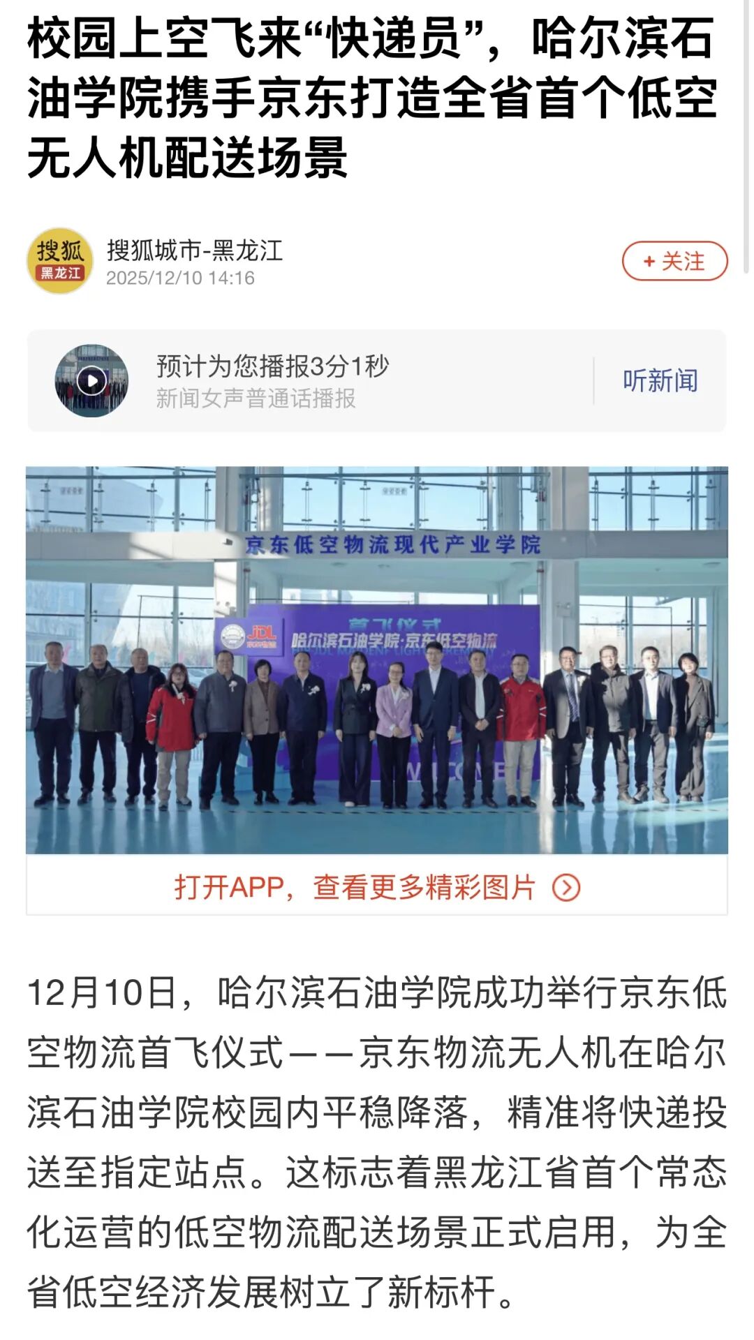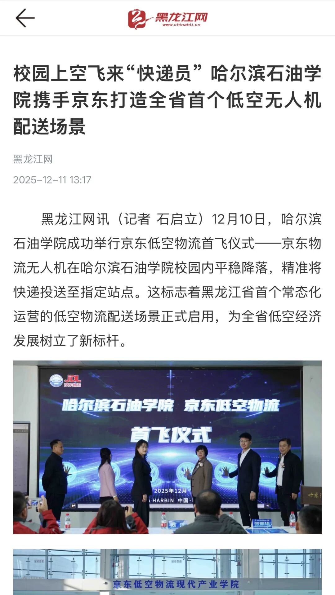 此次事件的广泛媒体关注,是社会各界对低空物流产业发展与产教融合创新的高度期待。未来,哈尔滨石油学院将继续深化校企合作,推动更多低空物流技术成果转化与实践场景落地,为低空经济输送专业人才,也为校园服务升级与行业创新贡献力量。