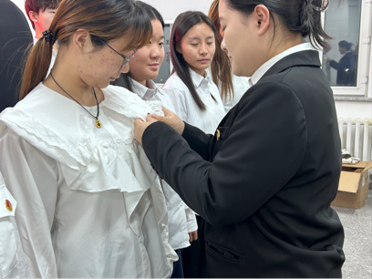 入团宣誓环节成为仪式的核心亮点。在老团员代表的带领下,全体新团员面向鲜艳的团旗,高举右拳,以铿锵有力的声音庄严宣誓:“我志愿加入中国共产主义青年团,坚决拥护党的领导,遵守团的章程……为共产主义事业而奋斗。”这不仅是新团员对团组织的郑重承诺,更彰显了新时代青年紧跟党走、矢志奋斗的坚定决心,让每一位团员接受了一次深刻的思想洗礼和精神淬炼。宣誓完毕后,老团员代表为新团员代表佩戴团徽,当闪耀的团徽别在新团员胸前时,标志着他们正式成为中国共产主义青年团的一员。