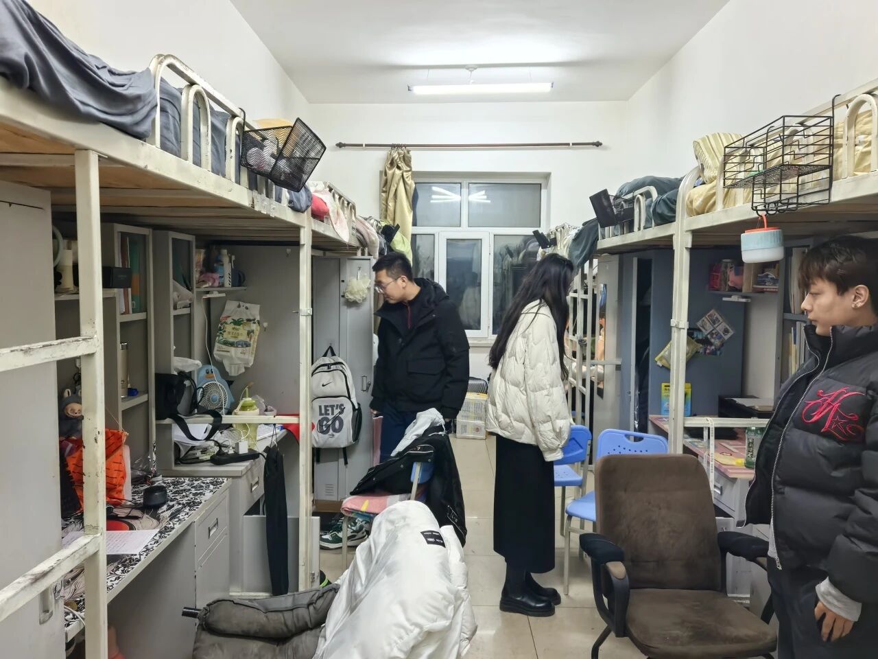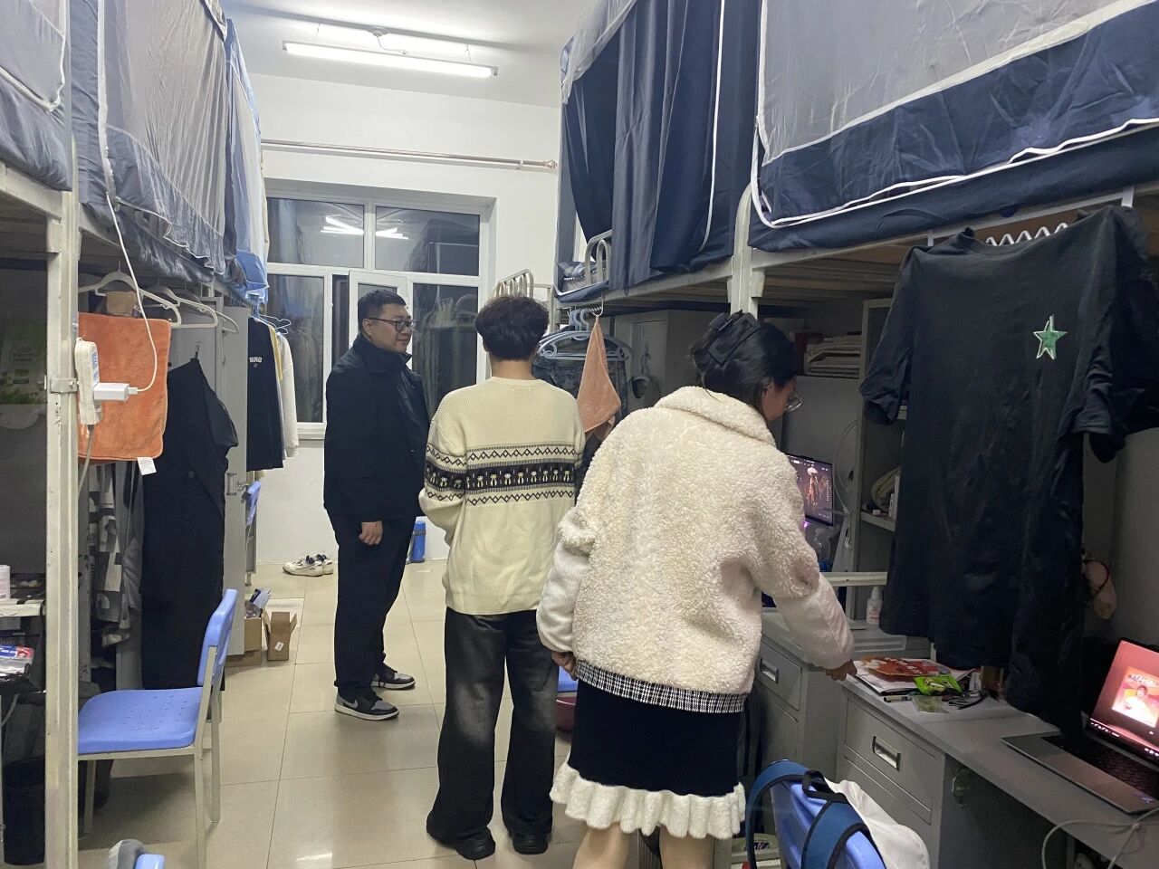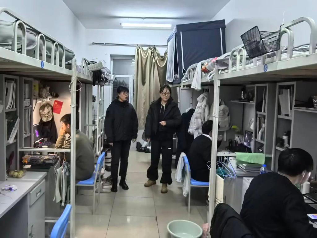 检查过程中,辅导员们每敲开一扇门,都与学生们进行亲切交谈。他们不仅严格核对学生归宿、寝室卫生情况,对个别暂未归寝的学生及时取得联系、核实动向并做记录,更将检查过程转化为一次与学生深入的交流机会。辅导员们细心询问同学们近期的学业、生活情况,并现场聆听了学生们对宿舍管理的意见和建议。他们反复叮嘱学生,要时刻将人身财产安全放在心上,自觉遵守校园管理规定,共同维护和谐有序的住宿环境。