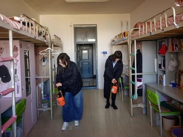 辅导员们对寝室、楼道、洗漱间等公共区域进行全面喷洒,确保环境消杀无死角。同时暖心叮嘱同学们“天气渐凉,适时增添衣物,做好保暖。”
