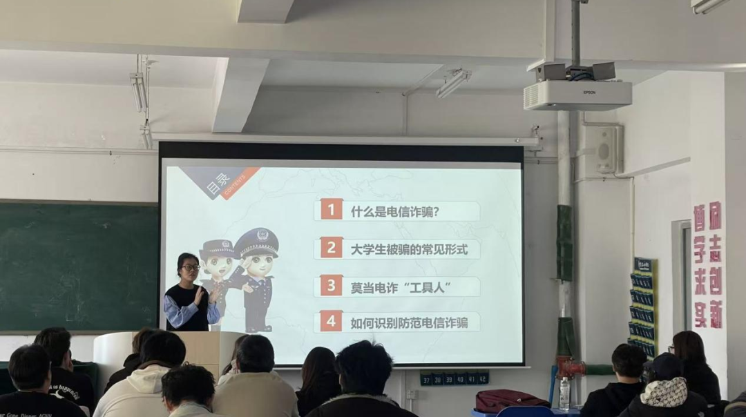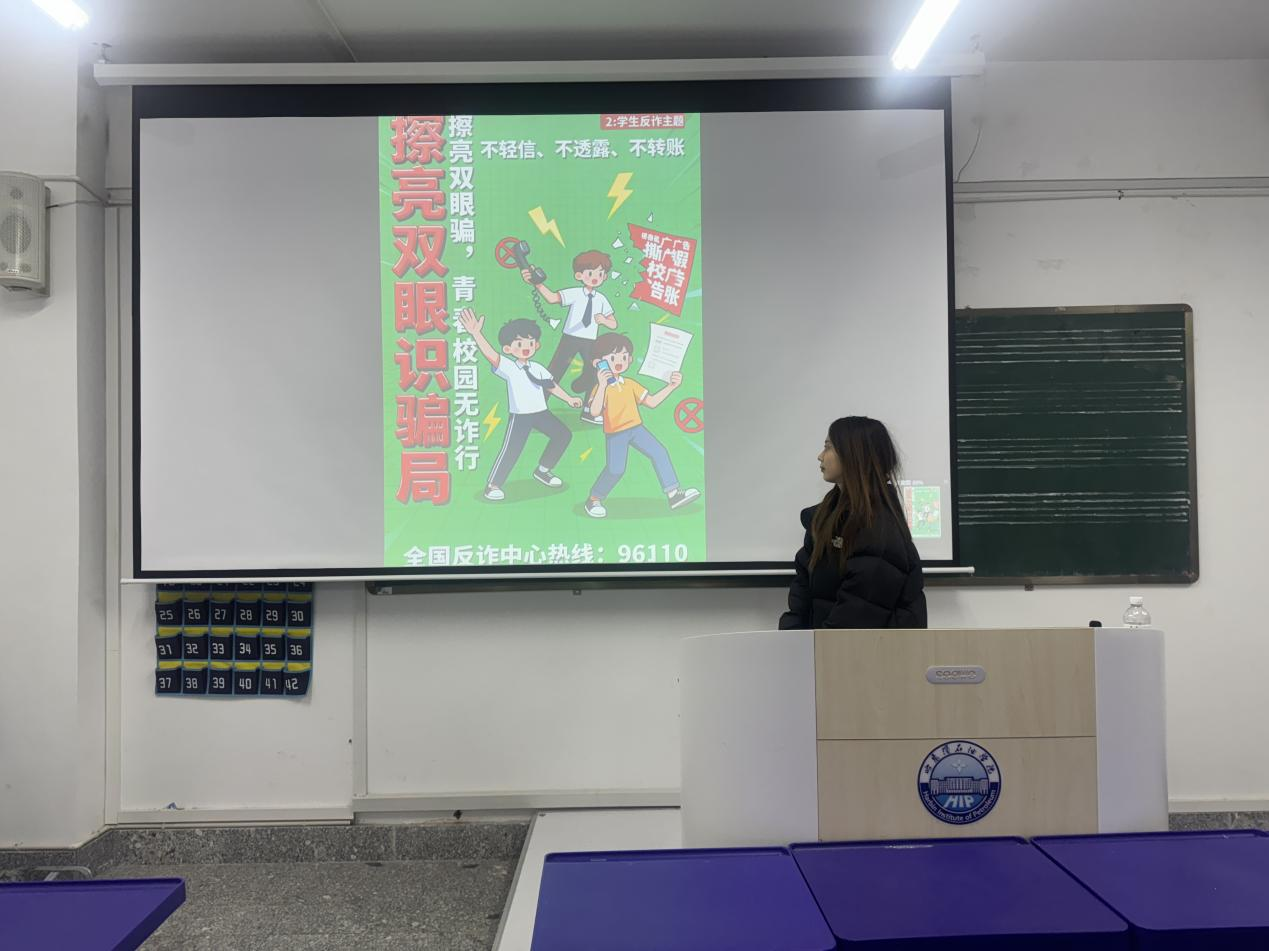 主题教育期间,各年级辅导员结合专业年级班级特点,围绕大学生群体高发的电信网络诈骗类型展开针对性讲解,重点剖析了冒充客服、虚假交易、刷单返利、校园贷、求职陷阱及“AI换脸”“共享屏幕”等新型诈骗手段。各年级同学还制作反诈海报,然后讲解和展示。班会特别强调“三不一多”防诈原则——不轻信、不透露、不转账、多核实,并通过真实案例警示、互动问答、宣传视频等多种形式,引导学生树牢安全底线思维。