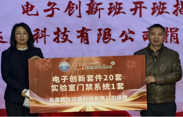 随后,电子创新班开班揭牌与捐赠仪式同步举行。朱佳梅院长与毕才术总经理共同为“电子创新班”揭牌,标志着校企联合培养创新型人才的全新实践正式启动。捐赠环节中,北京精仪达盛科技有限公司代表向学校递交捐赠设备清单,王义宁校长为企业颁发“捐赠证书”,感谢其对学校人才培养工作的大力支持。此次捐赠将为创新班学生的实践学习提供有力保障,助力学生提升专业技能与创新能力。