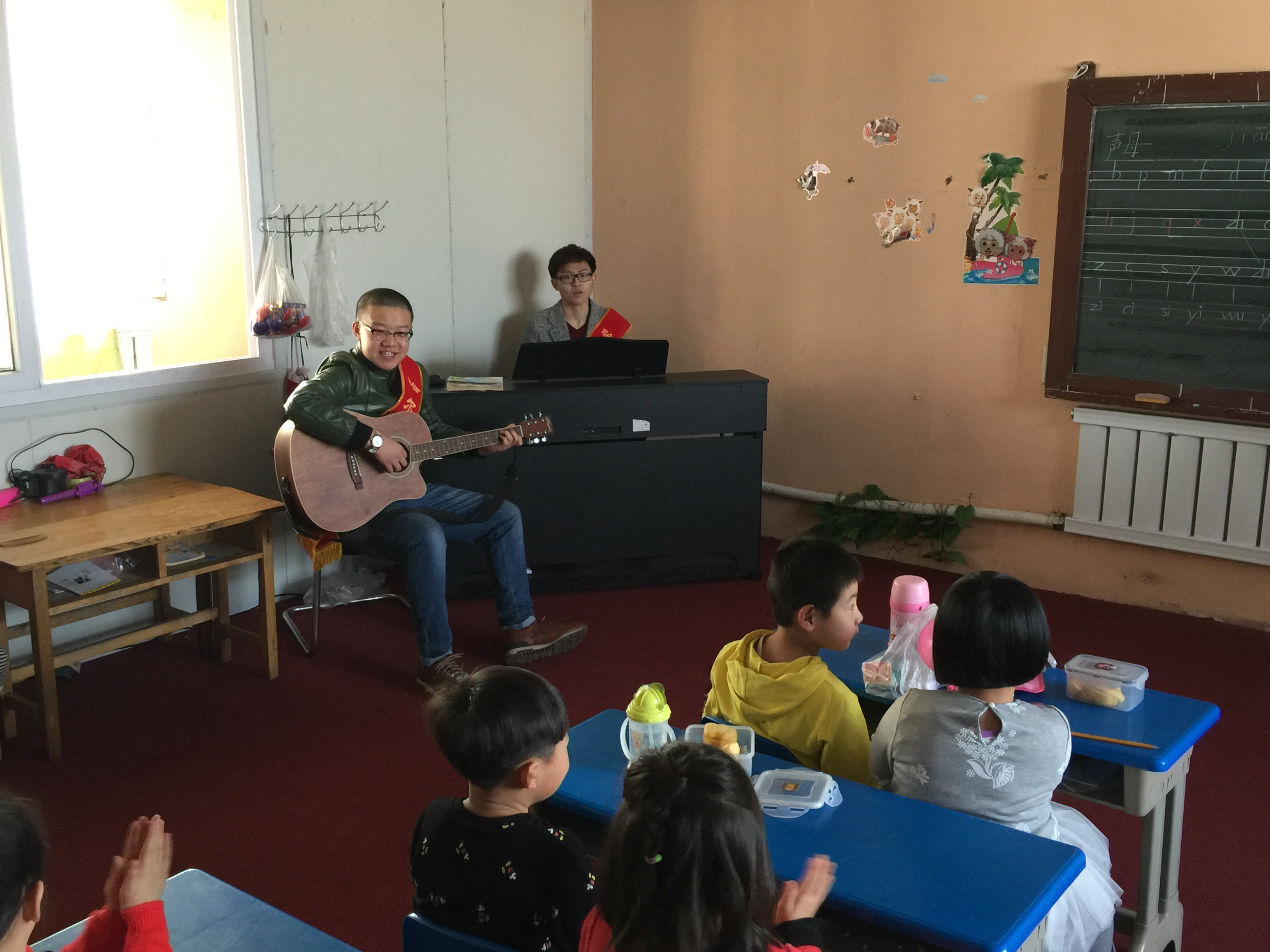 志愿者们走进幼儿园,刚刚午休完毕的小朋友们立刻活泼起来。志愿者们为幼儿园的小朋友们分发了为大家精心准备的小礼物,拿到了哥哥姐姐们带来的礼物,小朋友们特别高兴,志愿者们陪小朋友们聊天做游戏,小朋友们还为大家带来了精彩的节目,志愿者们为小朋友们带来钢琴和吉他伴奏大家合唱了《我是一个粉刷匠》等些列儿歌。