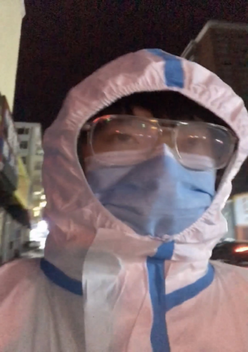 在室外执勤的时候,王梓涵同学细心讲解当前疫情的严峻形势和政府所下达的防控命令,并积极劝告路人说:“在这个关键时期,请大家减少外出,你们在家待着就是对抵抗疫情所做的最大贡献”。在晚上室外温度达到了-31℃,因为防护服密不透风,王梓涵同学戴着的口罩也被汗水浸透,眼镜上也因水蒸气结了一层冰,但是他依然坚守岗位。
