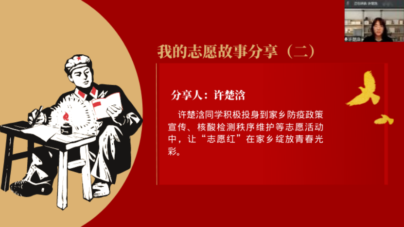 会议中,四位志愿者分享了他们利用寒假实践,积极地参与到社区疫情防控志愿队伍中,遇见了一件又一件感人暖心的故事,以及许多前辈在抗疫前线无私奉献的所见所闻。志愿者们这些难忘的人生经历与人生感悟,让同学们深感人间温暖。