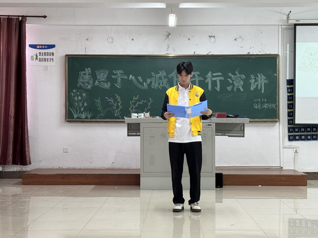 为深入践行社会主义核心价值观,增强学生诚信意识,营造良好的校园氛围。2024年6月4日,信息工程学院于二教四楼开展“以诚感恩”演讲比赛。