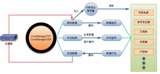 从图中可以了解到,ComManagerTCP(或ComManagerUSB)程序与各子程序之间主要是通过通知以及功能性全局变量来实现通信,当然还有用到了普通全局变量来传递网络连接的状态。
